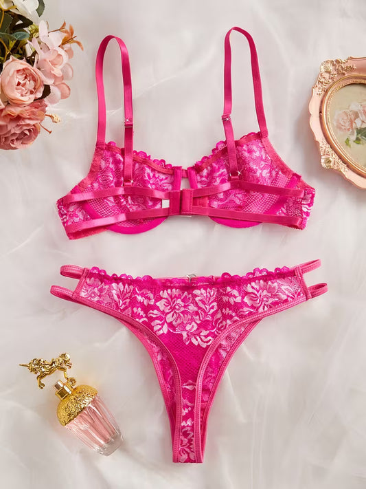 Pinkes Spitzen-BH-Set mit floraler Stickerei & String – Sinnliche Dessous aus transparentem Tüll
