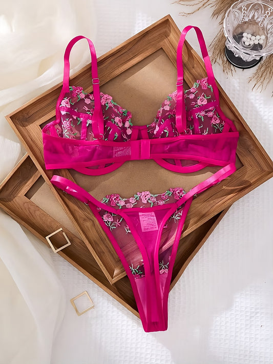 Pinkes Spitzen-BH-Set mit floraler Stickerei & String – Sinnliche Dessous aus transparentem Tüll