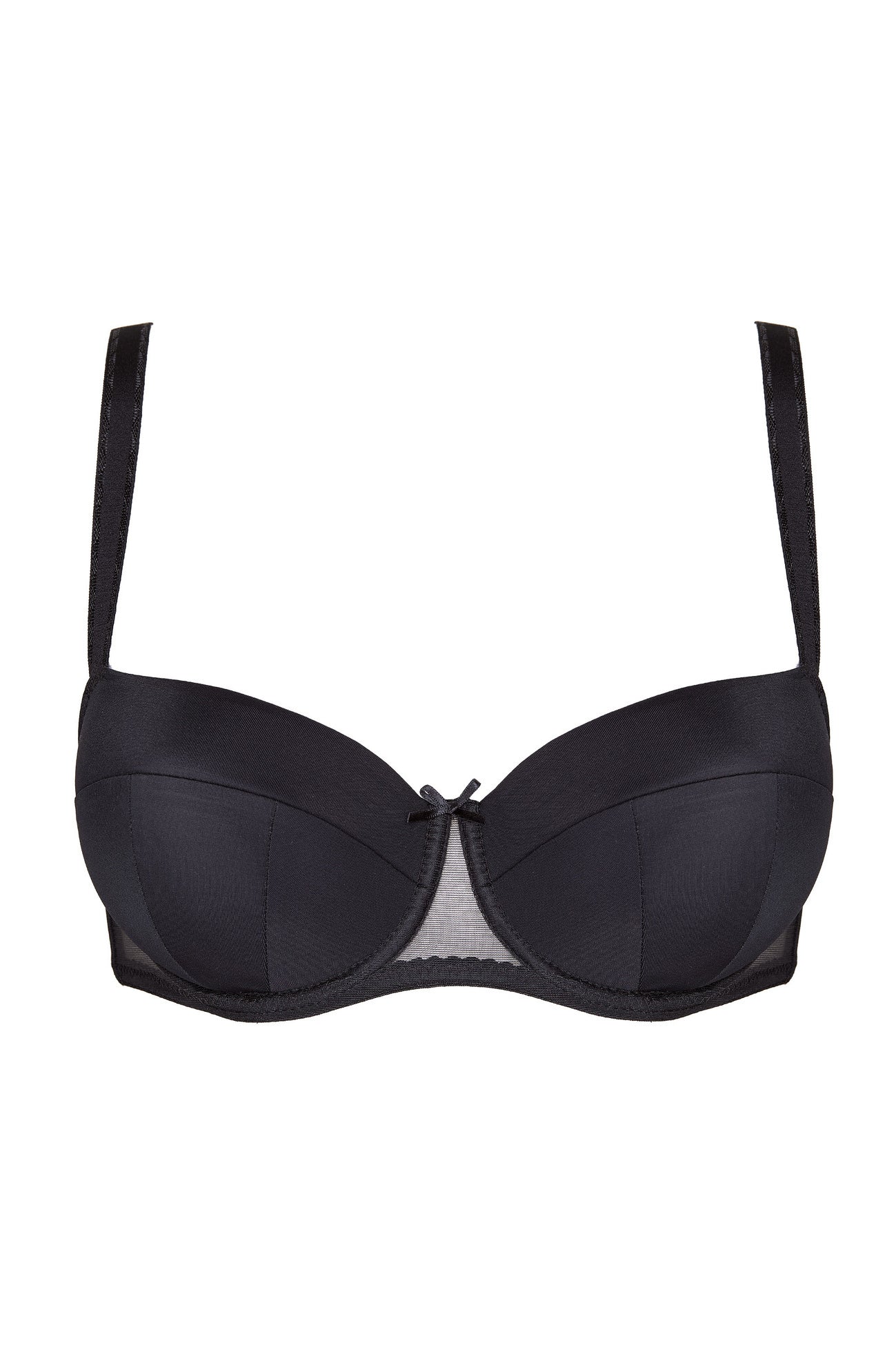 Gepolsterter BH in Schwarz. Schalen aus dünnem Korsettschaum, außen mit glattem Strickstoff überzogen. Zwischen den Cups befindet sich eine kleine Zierschleife. Die Innenseite der Cups ist mit Baumwolle nach OEKO-TEX-Standard beschichtet und somit hautfreundlich. Der Rücken des BHs besteht aus elastischem Tüll. Vertikale seitliche Fischgräten stabilisieren den Umfang des BHs. Der BH wurde in Polen entworfen und genäht.