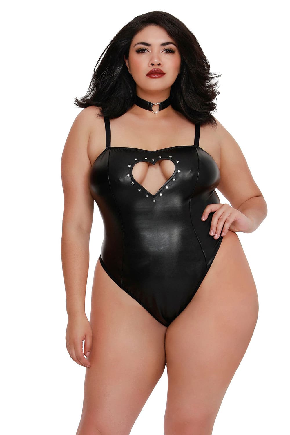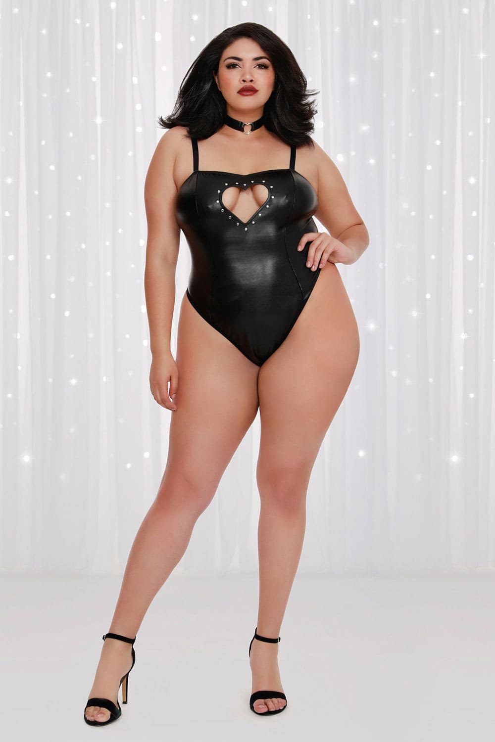 Body made of stretch faux leather with adjustable straps. With heart neckline and silver stud details. The back is made of elastic mesh with neckline and adjustable fasteners. The adjustable faux leather collar with heart ring is included.