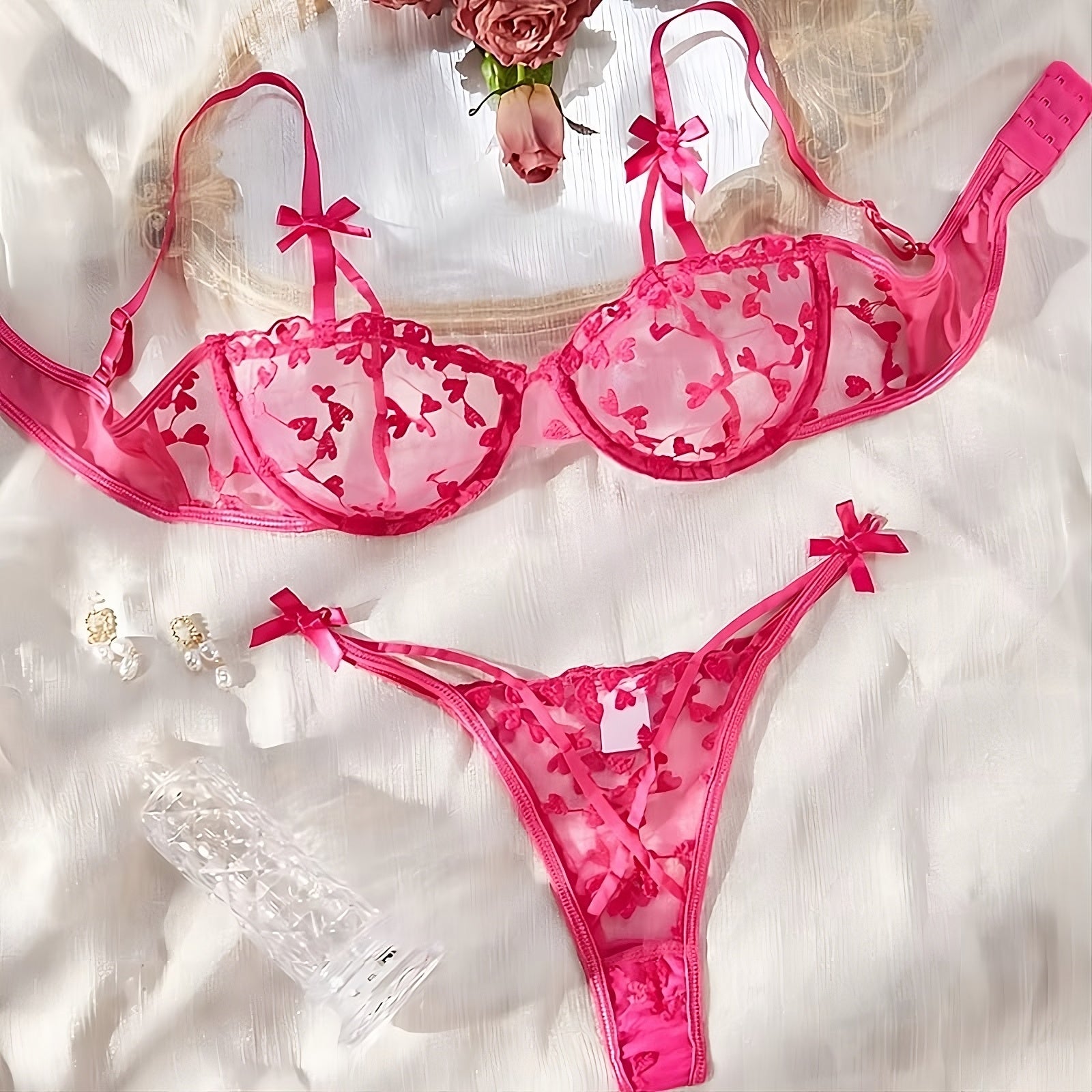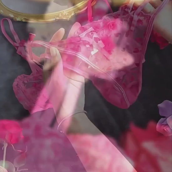 Romantisches, zweiteiliges Mesh BH-Set in pink. Ein bestickter BH mit Blumenmuster sowie verstellbaren Trägern. Dazu ein passender String mit.