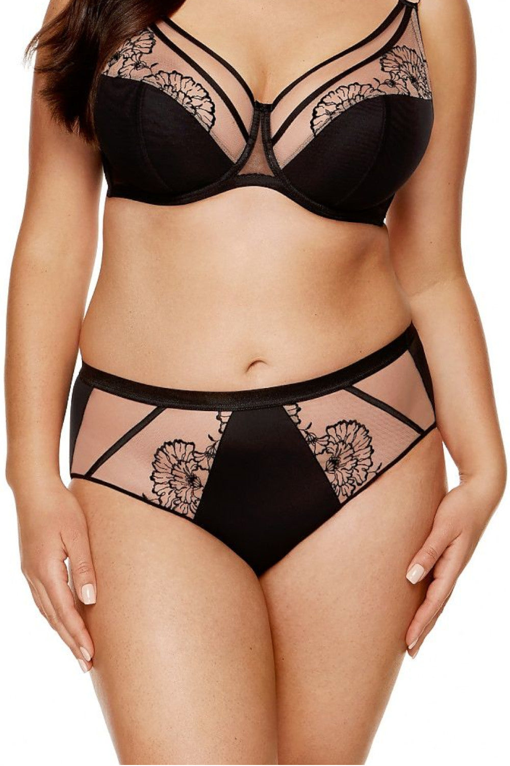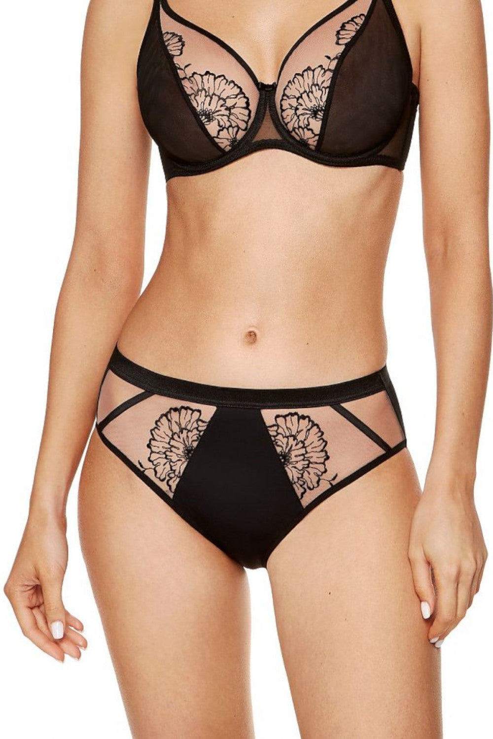 Elegantes Höschen in Schwarz und Beige. Aus glattem Strick, Netz und floraler Stickerei. Auffällige Tüllverzierung auf der Rückseite des Höschens. Ein breiter, glänzender Gummibund hält das Höschen an seinem Platz. Der Zwickel des Slips ist aus Baumwolle mit OEKO-TEX?-Standard gefertigt, was ihn angenehm und sicher für den Intimbereich macht. Die Höschen werden in Polen entworfen und genäht.