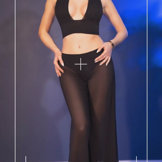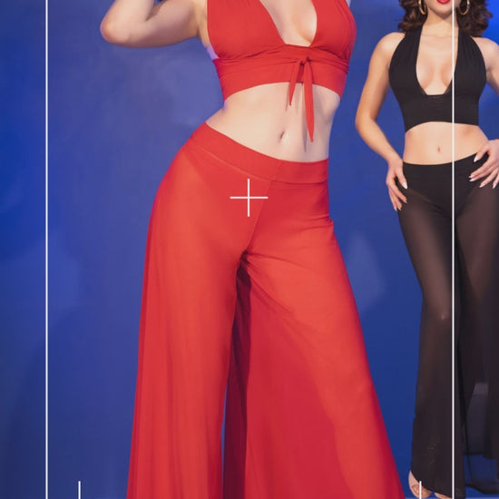 Dieses rote/schwarze Set beflügelt die Sinne. Ein Top, das auf verschiedene Weise gebunden werden kann, um Ihre individuellen Vorzüge zu betonen. Die durchsichtige Schlaghose sorgt für einen Hauch von Eleganz und schmiegt sich sinnlich an den Körper. Vervollständigt wird der Look durch den String, der Ihre Reize besonders betont. Dieses Set umschmeichelt die Haut und überlässt gerade genug für die Fantasie.