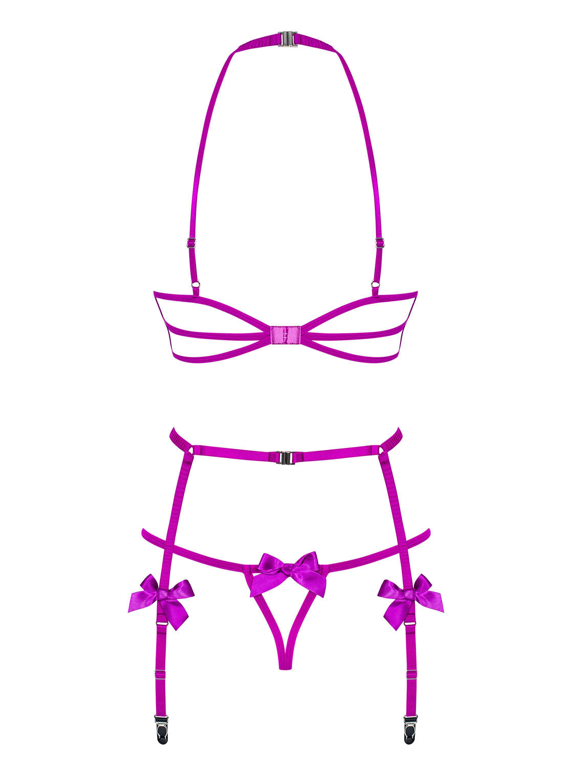 Auffälliges, violettes Dessous-Set aus glänzendem Metallic-Material und elastischen Riemchen. Ein Neckholder-Top mit Rückenverschluss, verstellbaren Trägern, offenen Bügel-Cups und charmanten Schleifen. Dazu ein elastischer und verstellbarer Strumpfhaltergürtel mit Schleifen und Schmuckdetail sowie ein passender String mit Anhänger. Die abgebildeten Strümpfe sind nicht im Lieferumfang enthalten.