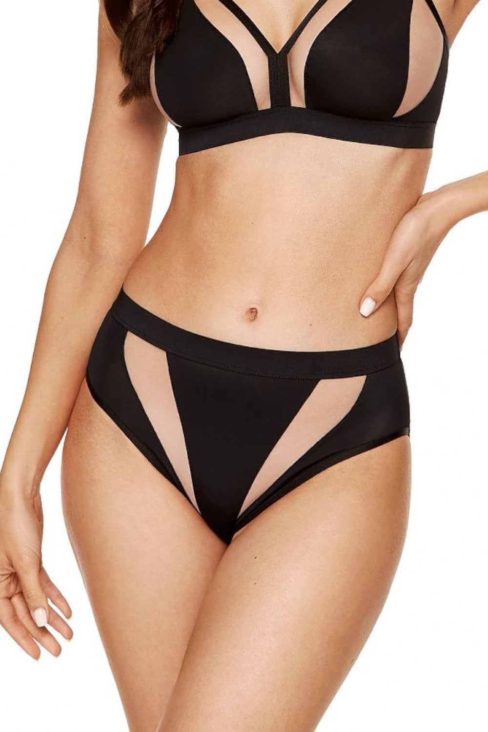 Höschen aus gestricktem Stoff, verziert mit Netzeinsätzen auf der Vorderseite. Mittlere Leibhöhe, breiter elastischer Bund hält das Höschen den ganzen Tag an seinem Platz. Der Bund sorgt dafür, dass das Höschen den ganzen Tag an seinem Platz bleibt. Der Zwickel des Höschens ist aus Baumwolle mit OEKO-TEX-Standard hergestellt, was es angenehm und sicher für Ihren Intimbereich macht. Das Höschen wird in Polen entworfen und genäht.