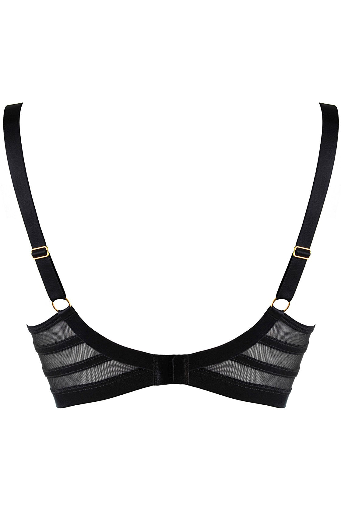 Ein eindrucksvoller BH mit beigen, halbtransparenten Cups. Das geometrische Muster aus dünnen, schwarzen Streifen betont die natürliche Schönheit der Brust. Goldene Details verleihen Eleganz. Der BH wird mit einem Hakenverschluss geschlossen, die Träger sind in der Breite des passenden Größes verstellbar und nicht abnehmbar.